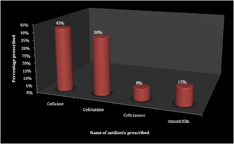 Among all antibiotic prescribed, 42% was Cefixime, 38% was Cefotaxime, 8% was Ceftriaxone and 12% were Amoxicillin. Fig 3