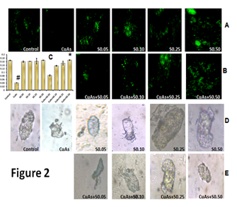 Fig. 2: Changes of intactness of mitochondria. (A-B) Janus green B stained (40X magnification), (C) graphical representation of changes of mitochondrial intactness and (D-E) Janus green B stained (Bright field microscopy; 40X magnification); CuAs = copper-ascorbate incubated group; S0.05-0.50= group incubated with Silymarin at the dose of 0.05-0.50mg/ml respectively (positive control); CuAs- S0.05-0.50= group co-incubated with copper-ascorbate and silymarin at the dose of 0.05-0.50mg/ml respectively; The values are expressed as Mean ± S.E.; #P < 0.001 compared to control values using ANOVA. *P < 0.001 compared to copper-ascorbate incubated values using ANOVA.