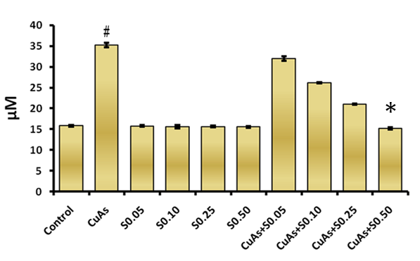 CuAs = copper-ascorbate incubated group; S0.05-0.50= group incubated with silymarin at the dose of 0.05-0.50mg/ml respectively (positive control); CuAs-S0.05-0.50= group co-incubated with copper-ascorbate and silymarin at the dose of 0.05-0.50mg/ml respectively; The values are expressed as Mean ± S.E.; #P < 0.001 as compared to control values using ANOVA; * P < 0.001 as compared to CuAs-treated values using ANOVA.