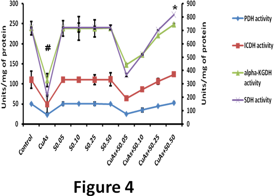 Fig. 4: Protective effect of silymarin against copper-ascorbate-induced alteration in the pyruvate dehydrogenase and other Kreb’s cycle enzymes in goat heart mitochondria. CuAs = copper-ascorbate incubated group; S0.05-0.50= group incubated with silymarin at the dose of 0.05-0.50mg/ml respectively (positive control); CuAs- S0.05-0.50= group co-incubated with copper-ascorbate and silymarin at the dose of 0.05-0.50mg/ml respectively; The values are expressed as Mean ± S.E.; #P < 0.001 compared to control values using ANOVA. *P < 0.001 compared to copper-ascorbate incubated values using ANOVA.