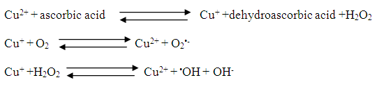 As evident from the above reaction, O2- anion radical is generated by Cu2+. The activity of superoxide dismutase which is found to be increased in mitochondrial compartments may be due to generation of this O2-anion radical. As the catalase enzyme is absent in mitochondria, so it is quite impossible to quench this H2 O2 overload. Hence, this hydrogen peroxide generates.OH responsible for lipid peroxidation, protein carbonylation, depletion of mitochondrial GSH (that is also evident from decreased activities of GPx and GR). Additionally the generated hydroxyl radical causes declining activities of NAD linked enzymes like pyruvate dehydrogenase, α-keto glutarate dehydrogenase, isocitrate dehydrogenase as well as FAD linked enzyme i.e. succinate dehydrogenase (all of them are associated with electron transport chain for oxidative phosphorylation.) that again will generate more superoxide anion through electron transport chain and which will follow above reaction scheme and overload of excess hydroxyl radical will be exerted on the mitochondria and finally mitochondria will be fragile as evident from our studies using scanning electron microscopy.