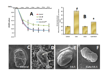 Fig. 5: Protective effect of silymarin against copper-ascorbate-induced (A) decrease in mitochondrial swelling and (B) increase in di-tyrosine level. (C-F) Scanning electron micrograph (X6000) of mitochondrial surface. Arrow heads indicate perforated surface of mitochondria. CuAs = copper-ascorbate incubated group; S0.50= group incubated with silymarin at the dose of 0.50mg/ml respectively (positive control); CuAs-S0.50= group co-incubated with copper-ascorbate and silymarin at the dose of 0.50mg/ml respectively; The values are expressed as Mean ± S.E.; #P < 0.001 compared to control values using ANOVA. *P < 0.001 compared to copper-ascorbate incubated values using ANOVA.