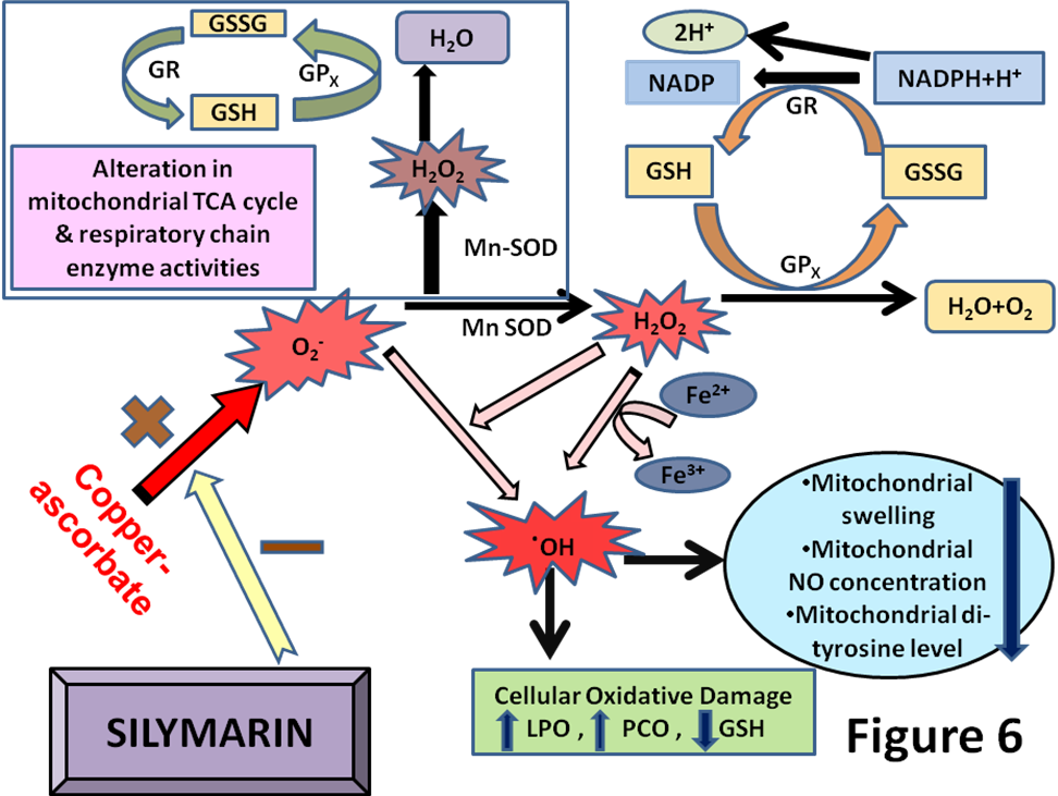 Mainly, it also prevented lipid peroxidation and protein carbonylation in Cu-ascorbate induced samples of mitochondria through removal of hydroxyl radicals. It also ameliorated oxidative stress by protecting the activities of Kreb’s cycle enzymes. Reduce levels of activities of these enzymes may cause generation of superoxide anion radical using molecular oxygen as an electron sink. Superoxide anion free radicals if generated will cause hydroxyl radical generation, which in turn will result in oxidative cell damage. By altering liver cell membranes, silymarin inhibits toxin uptake and stimulates cell regeneration [8]. Silymarin’s potent antioxidant activity helps to quell inflammation and replenish glutathione [8]. Glutathione is the chief antioxidant inside most living cells and is the main line of defense against free radical damage. It is found in high concentrations in the liver. In a review of viral hepatitis studies, silymarin decreased liver enzymes known as serum transaminases [43] and improved symptoms and general well-being [44]. Regarding activity against hepatitis C virus, silymarin and its components were anti-inflammatory. All compounds blocked virus-induced oxidative stress. Multiple assays suggest that numerous milk thistle compounds may help ameliorate hepatitis C disease [45]. In conclusion, silymarin can be very effective antioxidant and can protect biological systems against the oxidative stress that is found to be an important pathophysiological event in a variety of diseases including aging, cancer, diabetes, cardiovascular disorders and rheumatoid arthritis. As far as we know, this is the first report to describe an antioxidant mechanism(s) (Figure 6) of protective effect of silymarin toward copper-ascorbate-induced mitochondrial oxidative damage. Therefore, as it is stated above silymarin shows high antioxidant capacity mainly due to its phenolic compounds and inhibits lipid peroxidation in mitochondrial in vitro models, the present study suggests that silymarin may be used in preventing free radical-related diseases as a dietary natural antioxidant supplement.