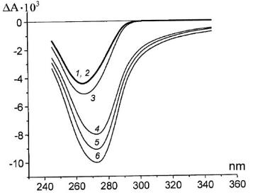 Fig. 1: Circular dichroism specter of CLCD-DNA, 1. in the absence of GdCl3,2-6–in the presence of GdCl3, ΔA–(A max–Ai), A max =∑ (A+-A-), where, A+-amplitude of absorption peak of dextrorotatory plane-polarized light, GdCl3 concentration: 2-2.49 × 10-4, 3-4.97 × 10-4, 4-9.8 × 10-4, 5–1.48× 10-3,6–2.92 × 10-3
