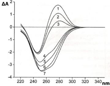 Fig. 2: Circular dichroism specter of CLCD-dsDNA, In the absence of GdCl3, 2-6–in the presence of GdCl3,ΔA–(A max–Ai), A max =∑ (A+-A-), where, A+-amplitude of absorption peak of dexter-rotatory plane-polarized light,, A--amplitude of absorption peak of sinister-rotatory plane-polarized light, Concentration GdCl3, 2 curve-1×10-5M, 3 curve-2×10-5M, 4 curve-3×10-5 M, 5 curve-4×10-5 M, 6 curve-5×10-5 M