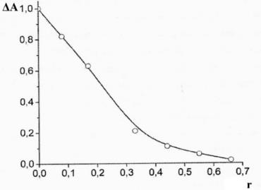 Fig. 3: Relative band amplitude (λ-280 nm) in the CD spectra of linear double-stranded DNA molecules on the value of r(total): ΔA(ratio)-[Amax-ΔAi]/[Amax ], wherein Amax =