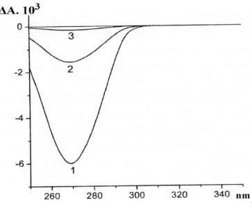Fig. 4: CD spectra of formed CLCD, from DNA molecules, pretreated with aGdCl3 solution; A = (AL-AR). Curve 1-CLCD in the absence ofGdCl3; Curves-2 and 3, in the presence of GdCl3, 0.6 ×10-5M, and 1×10-5 M respectively