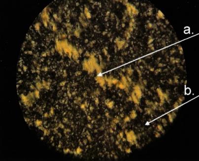 Fig. 4: Image of CLCD with the addition of Gd3+ions in the field of view of a polarization microscope, a. The section with strips (such as "fingerprints"), b. Amorphous section (dark)