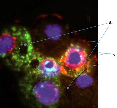 Fig. 5: The view of macrophages with attached CLCD (DNA-Gd) particles, a. Nanoparticles CLCD (DNA-Gd), b. Mice macrophages