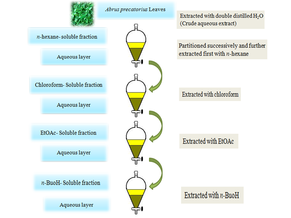 Aqueous leaf extracts of A. precatorius was prepared by the process of maceration. Dried plant sample was suspended in double distilled water at the rate of 10 gms in 100 ml, sonicated for 15 min and mixed with a magnetic stirrer for overnight. The extract was filtered through two layered cheesecloth. The collected filtrate was further partitioned successively into five solvent fractions by separating funnel starting from water, hexane, chloroform, ethyl acetate and butanol (21). The partitioning scheme was shown in (fig. 1). Finally, all the five fractions were dried under reduced pressure, dissolved in DMSO and subjected to cytotoxic activity assay.