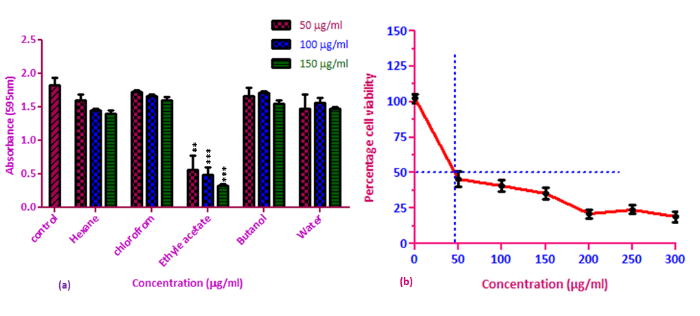 Fig. 2: Cytotoxic activity of various solvent fractions on MDA-MB-231 cells (a) ethyl acetate fraction of A. precatorius (EAF-AP) showed significant cytotoxic activity at concentration (50-150 µg/ml) after 48 h of treatment (b) Dose dependent cytotoxic activity of EAF-AP on MDA-MB-231 cells was observed, with an IC50 value of 47.3 µg/ml. Values are mean±SEM of at least three independent experiments, each in triplicates. Values are mean±SEM of at least three independent experiments, each in triplicates. Significant cytotoxic activity (p value ≤ 0.05) between the groups