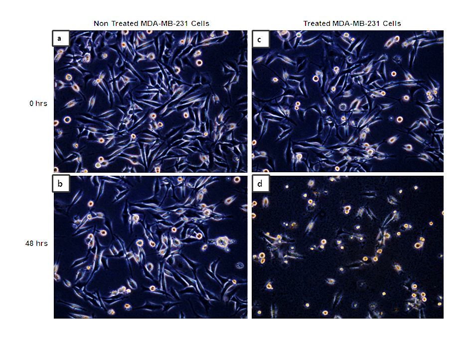 Fig. 3: Microscopic view of human breast cancer MDA-MB-231 cells (10X magnification) (a) Non-treated control cells at 0 h and (b) 48 h; (c) Treated cells at 0 h and (d) 48 h at with IC50 concentration (47.3 µg/ml)