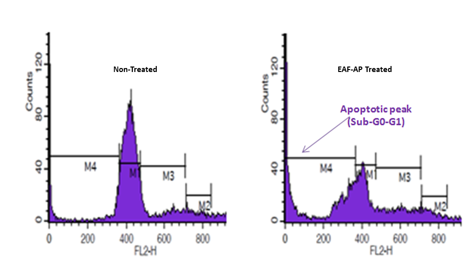 As EAF-AP has a potent cytotoxic activity on MDA-MB-231 cells, it was necessary to investigate the nature of cell death in these cells. FACS analysis is conventionally performed to assess whether a compound induces cell cycle arrest or apoptosis in a cell. As shown in fig. 4, FACS analysis indicates that treatment of MDA-MB-231 cells with EAF-AP induces apoptosis in these cells. A significant increase (from 11.8% to 53.46%) in sub G0/G1 population of cells is observed upon treatment with EAF-AP in comparison to control cells (table 2). Further, not much change in the cell population of S-phase or G2 was observed, suggesting that EAF-AP may not have a cytostatic activity. These results show that EAF-AP has a pro-apoptotic activity on MDA-MB-231 cells.