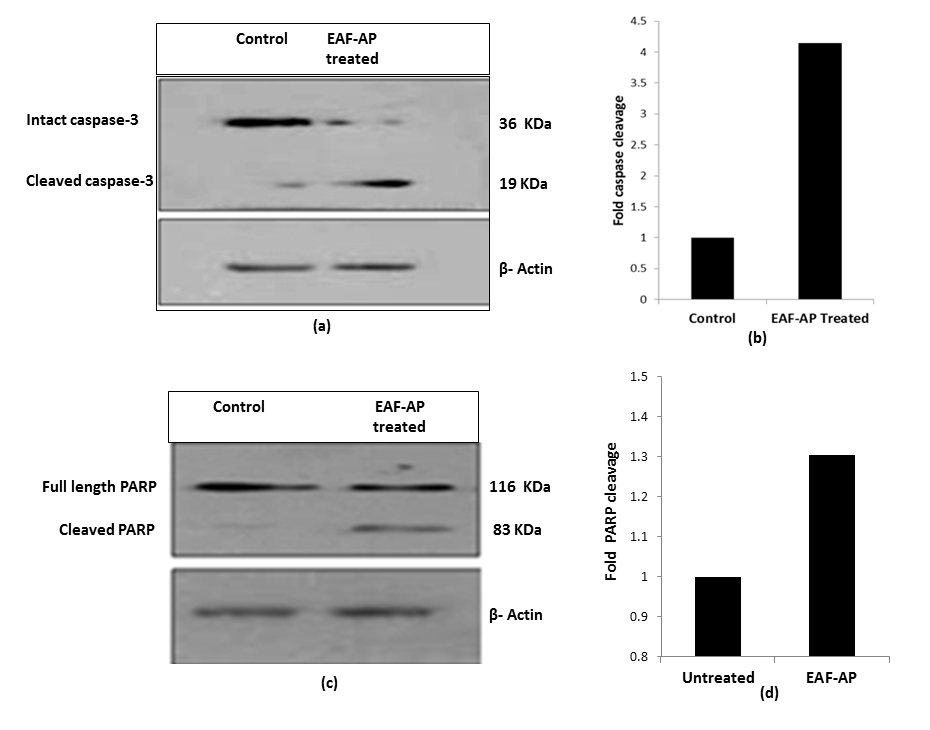 When a cell undergoes apoptosis, caspase-3 gets cleaved that leads to its activation. Western blotting analysis was performed to analyze cleavage and the activation of caspase-3 upon EAF-AP treatment of MDA-MB-231 cells. Treatment of MDA-MB-231 cells with EAF-AP results in proteolytic cleavage of caspase-3 as revealed by the appearance of 19 kDa cleaved fragment of caspase-3 (fig. 5a). The densitometry analysis of the western blot indicated 4 fold increase in cleavage of caspase-3 upon treatment with EAF-AP (fig. 5b). Activation of caspases leads to degradation of several target proteins and enzymes involved in cell cycle progression and DNA repair. A well-known target of caspases is PARP; an enzyme involved in repairing the DNA damage in a cell. Western blot analysis shows that EAF-AP treatment of MDA-MB-231 cells leads to cleavage and hence inactivation of PARP. This was revealed by the appearance of 83 kDa cleaved fragment of PARP in the western blot (fig. 5c). The densitometric analysis indicated around 1.33 fold increase in the cleavage of PARP upon treatment with EAF-AP in MDA-MB-231 cells (fig. 5d).
