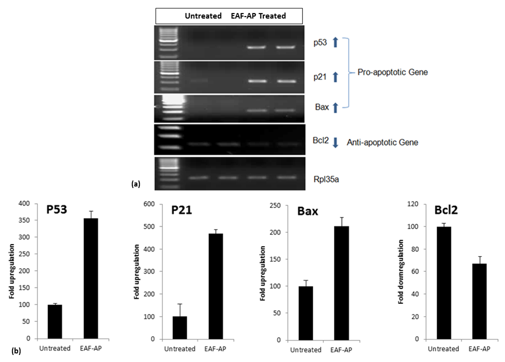 Semi-quantative RT-PCR analysis revealed a significant up-regulation of pro-apoptotic genes p53, p21 and Bax when treated with EAF-AP for 24 h (fig. 7a). In addition, down-regulation of anti-apoptotic gene Bcl-2 was also observed. The graphs below shows the quantitation of the change in expression levels of the respective genes (fig. 7b). Treatment of MDA-MB-231 cells with EAF-AP leads to approximately 3.5 fold up-regulation in p53, 4.7 fold up-regulation in p21 and 2.2 fold up-regulation in Bax gene expression level. Likewise, 1.61 fold down-regulation of anti-apoptotic gene Bcl-2 was observed in EAF-AP treated MDA-MB-231 cells. These results indicated that EAF-AP leads to a change in the expression of various cell cycle regulators and hence affects the survival of these cells.