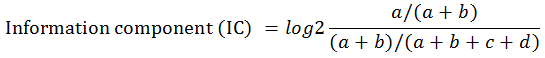 Whereas: a =No of events of interest with drug of interest, b = No of events of interest with other drugs in the database, c =No of events with drug of interest, d =Total no of events with all drugs.