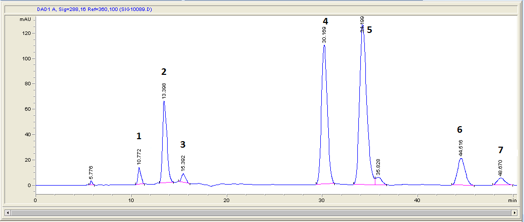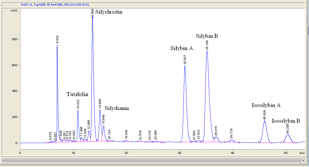A methanolic solution of standard silymarin (0.7 mg/ml) was used to understand the chromatographic behaviour of the flavonolignan components of silymarin in analytical conditions.