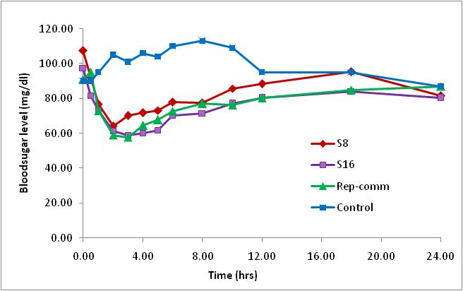 The animals fasted overnight prior to oral dosing of the test samples. Randomized cross-over design was adopted for comparing the pharmacology of both SNEDDS formulations and the marketed product (Novonorm® 0.5). Samples of animal blood (one drop) were withdrawn at zero time and at time interverals (30 min and 1,2,3,4,5,6,8,10,12,18,24 hrs) directly onto the strip of an automatic blood glucose checking apparatus (Accu-Chek Active blood glucose meter, ROCHE, Germany). The results were taken in triplicate for both the control and treatment groups (Fig. 4).