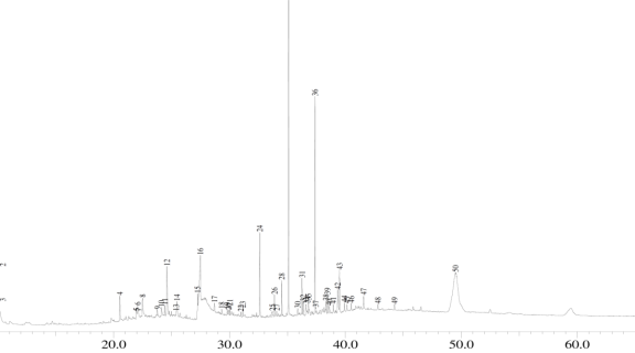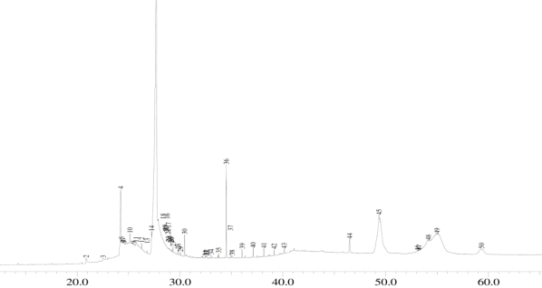 Fig. 4: Gas chromatogram of the ethyl acetate extract of the leaves of N. cadamba. Benzaldehyde (1), benzyl alcohol (2), pentanoic acid, 4-oxo-, phenylmethyl ester(6), benzyl ether (8), tetradecanoic acid (10), n-hexadecanoic acid (16),octadecanoic acid, ethyl ester (21), 1,2-benzenedicarboxylic acid, diisooctyl ester (28), progesterone (42), and tetratetracontane (45)