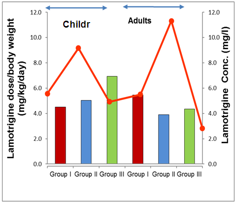 Lamotrigine dose/kg body weight when compared with the LTG concentrations (Figure 1) suggest that amongst children on similar LTG dose, the levels showed a 65% increase in case of co-medication with VPA while amongst adults, 105% increase in concentration was obtained even when LTG dose was reduced by 29%.