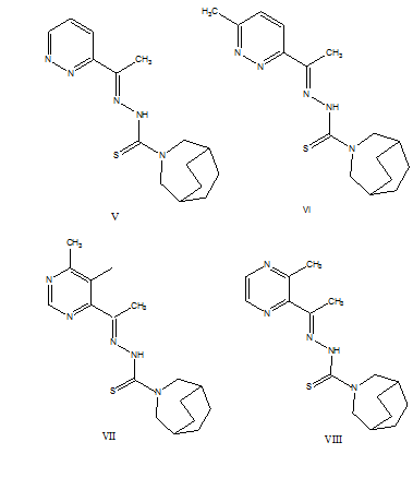 It has been reported that thiosemicarbazones (TSCs) are potent antitumor agents that inhibit Topo-II. The relationship between the In vitro and In vivo behavior of novel 64Cu-thiosemicarbazide complexes and the expression of Topo-II activity has been developed by Wei and group [44]. They prepared four 4N-azabicyclo[3.2.2]nonanethiosemicarbazide derivatives (V-VIII) and radiolabeled them with 64Cu successfully to form lipophilic cations.