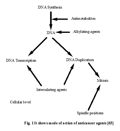 Cancer is the uncontrolled growth of cells coupled with malignant behavior: invasion and metastasis (among other features) [59] and is caused by the interaction between genetic susceptibility and environmental factors [60-61]. The available anticancer drugs have distinctly different mechanisms of action which may vary at different drug concentrations and in their effects on different types of normal and neoplastic cells. There are very few demonstrable biochemical differences between cancerous cells and normal cells. For this reason the effectiveness of many anticancer drugs is limited by their toxicity to normal rapidly growing cells in the intestinal and bone marrow areas. It is important to know that how anticancer drugs act at the cellular level to inhibit the growth of, or to destroy, susceptible cells. Most chemotherapeutic drugs work by impairing mitosis (cell division), effectively targeting fast-dividing cells and are cytotoxic in nature. As chemotherapy affects cell division, tumors with high growth rates are more sensitive to chemotherapy, as a larger proportion of the targeted cells are undergoing cell division at any time. Malignancies with slower growth rates, such as indolent lymphomas, tend to respond to chemotherapy much more modestly [62]. The role of anticancer drugs is to slow and hopefully stop the growth and spreading of cancer. There are three possible ways which can be helpful in meeting the goals associated with the use of the most commonly-used anticancer agents.