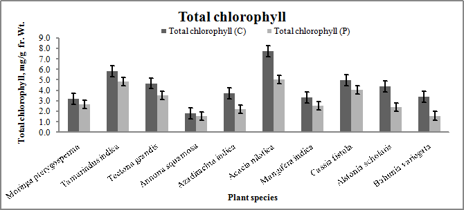 Results of total chlorophyll presented in table 1. Total chlorophyll found the maximum 5.1±0.0866 mg/g in Acacia nilotica and the minimum 1.6±0.0116 mg/g in Annona squamosa. The study revealed that total chlorophyll decreased significantly in plant leaves at the polluted area as compared to the control area. Reduction in chlorophyll content observed the minimum for Annona squamosa (5.9%), followed by Moringa pterygosperma (8.5%) and Tamarindus indica (9.3%). Reduction in chlorophyll content found the maximum for Bahunia variegata (36.0%), followed by Alstonia scholaris (29.4%) and Azadirachta indica (25.4%).