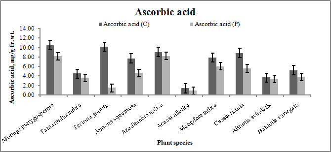 Ascorbic acid content found less in all selected plant species of the polluted site. It ranged maximum in Azadirachta indica 8.24±0.3605 mg/g fr. wt. and minimum in Acacia nilotica 0.93±0.1 mg/g fr. wt. Ascorbic acid acts as an antioxidant and develops the mechanism of a plant to resist against the adverse atmospheric conditions [25]. Ascorbic acid plays a role in the cell wall synthesis, defence and cell division [26]. It is also a strong reducer and plays an important role in photosynthetic carbon fixation [27]. Moreover, its high level in plants indicated high tolerance level of plant species against pollutions and its lower values rank the plants in a sensitive category against air pollution [28, 29]. Thus, the decrease in the ascorbic acid content of plant species at polluted area may be due to vehicular emissions.