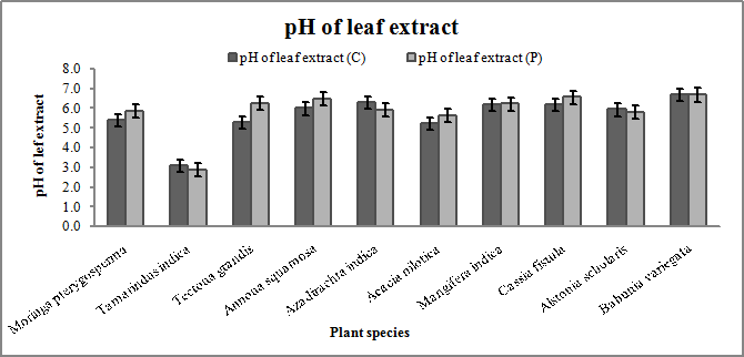 Note: pH of leaf extract (C)–pH of leaf extract at the control site, pH of leaf extract (P)–pH of leaf extract at the polluted site. Values are expressed as mean±SEM and the analysis was done in triplicates.