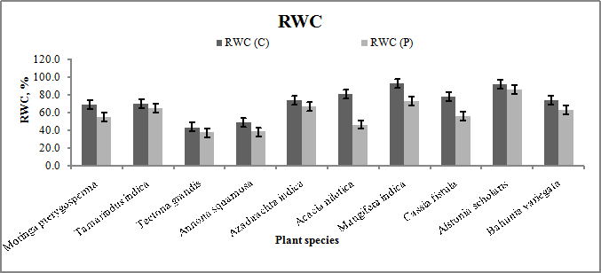 Reduction in RWC observed the minimum for Alstonia scholaris (3.4%), followed by Tamarindus indica (3.8%) and Azadirachta indica (4.7%). Reduction in RWC found the maximum for Acacia nilotica (26.6%), followed by Cassia fistula (16.2%) and Annona squamosa (12.6%).