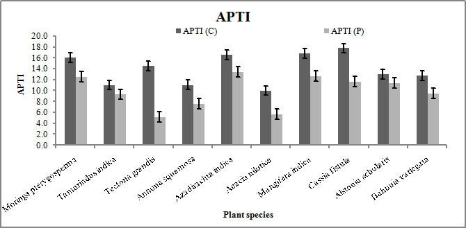 APTI index shows the capability of a plant to fight against air pollution. The APTI found the minimum in Tectona grandis 5.2±0.3247 and the maximum in Azadirachta indica 13.5±0.4404. The study reveals that the control site has more APTI than the polluted site. Reduction in APTI observed the minimum for Alstonia scholaris (6.6%), followed by Tamarindus indica (8.8%) and Azadirachta indica (18.7%). Reduction in APTI found the maximum for Tectona grandis (47.5%), followed by Acacia nilotica (27.4%) and Cassia fistula (20.7%). Results of APTI as shown in fig. 5.