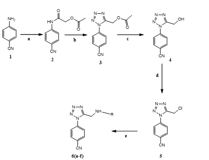 Methods: A series of novel 4-(5-substituted amino methyl)-1H-tetrazol-1-yl)benzonitriles 6(a-f) were prepared starting from p-aminobenzonitrile 1which is protected with acetoxyacetylchloride, and followed by tetrazole formation with CH3SiN3 in DIAD/TPP conditions to form the 1-(4-cyanophenyl)-1H-tetrazol-5-yl) methyl acetate 3. This compound was hydrolyzed, followed by chlorination and treated with different amines to produce the title compounds.