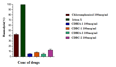Results of haemolysis assay suggested that ethyl acetate fractions of CDB-1and CDB-2 caused least haemolysis erythrocytes as compared to chloramphenicol (fig. 1).