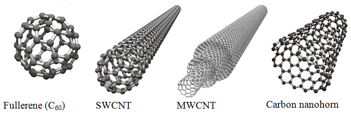 Fig. 4: Structures of various important carbon nanomaterials: Fullerene (C60), Single-Walled Carbon Nanotube (SWCNT), Multi-Walled Carbon Nanotube (MWCNT) and Carbon Nanohorn