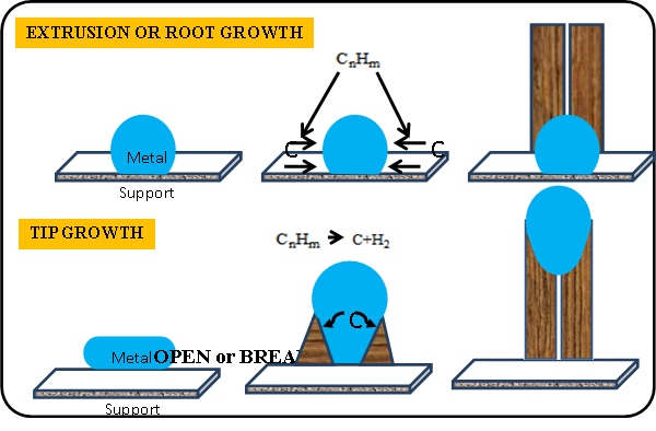 A rod-like carbon is producing quickly from metastable carbide particle. Secondly, CNT's wall contributes to slow graphitisation. For all technique nanotubes, actual growth mechanism seems similar [24]. On a growth mechanism of nanotubes, there are several theories one of which describes in (fig. 6), for supported metals, filaments can form either by ‘extrusion/root/base growth’ or by ‘tip-growth’. Catalyst size plays a role in the type of nanotube obtained whether SWNTs or MWNTs.