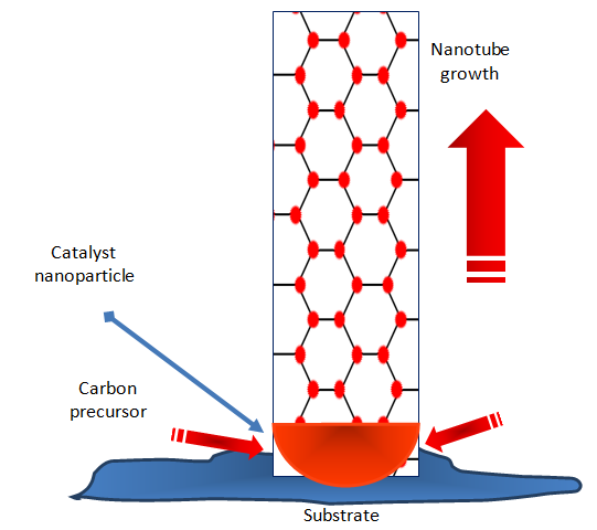 Fig. 7: Growth mechanism of nanotubes: gas based on carbon breaks apart on the surface of the catalyst by CVD, and nanotube grows outwards from the surface