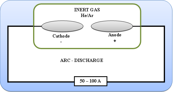 | Process | The first carbon nanotubes were developed with the arc-discharge method with no use of metal catalysts, producing MWCNTs [7]. Arc-vaporization of two carbon rods placed end to end, separated by approximately few millimetres apart (1 mm), in an enclosure that is usually filled with inert gas at low pressure. A direct current of 50 to 100 Amps, driven by a potential difference of approximately 20 V creates a high-temperature discharge between the two electrodes. The discharge vaporises the surface of one of the carbon electrodes and forms a small rod-shaped deposit on another electrode. Primarily used to produce C60 fullerenes, is the easiest and common way to produce CNTs. |