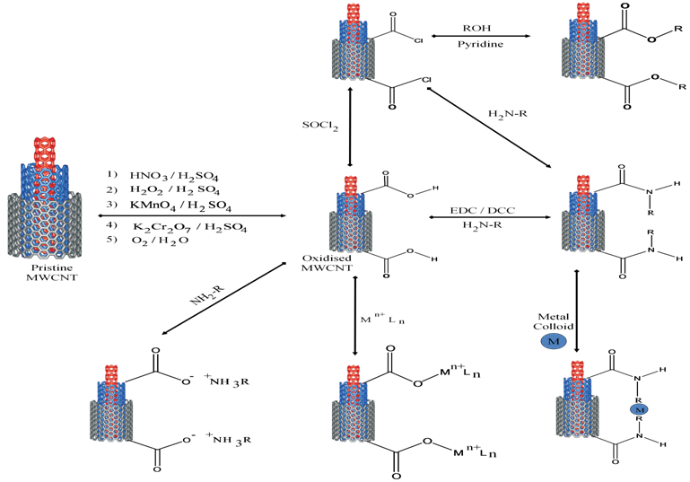 The physicochemical properties such as surface topography, solubility, hybridization state, mechanical properties, thermal conductivity, and structural and metallic or carbonaceous impurities, of CNTs, have to be evaluated for biomedical applications [36]. Purification is the primary step and is always needed before any further use of CNTs. Prepared CNTs contain an assortment of impurities that are essential to be removed prior to their utilisation in drug, gene or vaccine delivery. Zhao et al. 2001 [37] reported on the numerous approaches that may be utilised for purifying the prepared CNTs that involve filtration, microfiltration, centrifugation, chromatography, annealing, flocculation, oxidation of contaminant, ferromagnetic separation, functionalisation, ultrasonication, selective interaction with organic polymers, cutting, sedimentation and microwave irradiation. These purification techniques enhance the nanotube solubility, which is easier to separate from the insoluble impurities[38, 39]. CNT products contain substantial amounts of metal impurities and non-nanotube carbon. These are vanished by post-manufacturing treatments, and three fundamental methods have been reported for purification they are:
