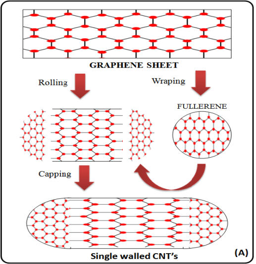 Pharmaceutical nanotechnology focuses on the top of formulating therapeutically energetic agents in biocompatible nanoforms such as nanoparticles, nanocapsules and conjugates. These systems suggest numerous advantages in drug delivery mainly focusing on better safety and efficiency of drugs i.e., targeted delivery of drugs, improve bioavailability, extending drug or gene effect of drugs, tissue and improving the stability of therapeutic agents in opposition to chemical/enzymatic degradation [1, 2] In the current scenario, nanotechnology is rapidly expanding scientific zone that has achieved a breakthrough in molecular biology, diagnostics, imaging, bioengineering and nanomedicines etc. Carbon nanotubes (CNTs) have established much recent interest as new entities for experimental disease diagnosis and treatment because of their unique electronic, mechanical, thermal, spectroscopic, metallic, semiconducting and superconducting electron transport properties structurally they acquire a hollow core made up of graphite sheets (fig. 1) which are rolled into tubes and are closed at their ends by semi-fullerene like structure [3] (fig. 2) making them appropriate for storing guest molecules as well as their ability to traverse cellular membranes and contain elastic or young’s modulus of any recognized materials [4, 5] thus seeing much attention as a potent carrier. The sphere-shaped C60 molecule was discovered in 1985 by Harry Kroto and Richard Smally during experiments with laser vaporisation of graphite [6]. Carbon nanotubes were later observed through efforts in fullerene research and were discovered by SumioIijima in 1991 [4]. The Kroto and Smally group detected the principal generation of C60 and hypothesised that it may exist as a stable closed assembly. Later work by Wolfgang Krätschmer and Donald Huffman developed larger quantities of fullerenes through an arc-discharge process and established the proposed spherical structure of C60 (fig. 3)[7]. Through transmission electron microscopy [8], Iijima scrutinised carbon soot made by the Krätschmer and Huffman method where he found CNTs. The early discovery was of MWCNTs, the smallest being double-walled, and afterwards, discoveries in 1993 independently reported on the first SWCNTs [9]. CNTs are a fullerene molecule was described in 1991 by SumioIijima as tube-shaped or toroidal shape or cylindrical shells of graphitic carbon, seamless, well-ordered, flat network, high aspect ratio allotropes of carbon having a diameter measuring on the nanometer scale. These carbon-based nanomaterials carbon nanotubes are generally known as buckytubes [4, 10, 11].