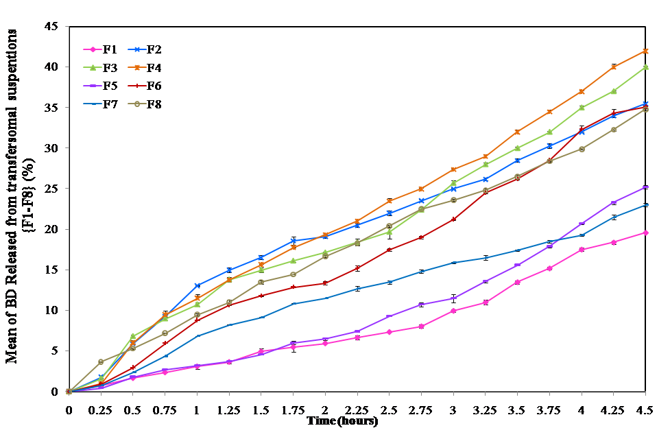 The use of thin film hydration method in the present work may be advantageous in improving EE compared with vortexing method [22]. All the tested BD-T formulations showed a relatively high EE% ranged from 69.1%±0.80 to 90.1%±0.76 (table 2). This increase in EE% may be attributed to the formation of a thin film with a large surface area which facilitates the complete hydration of vesicles [22].