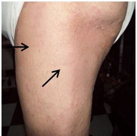 Fig. 5: A female patient with plaque type psoriasis: (a) left leg before treatment (PGA 4), (b) left leg after treatment with BD-T gel, (PGA 1), A female patient with plaque type psoriasis; (c) left leg before treatment (PGA=3) and (d) left leg after treatment with diprosone cream for 2 mo (PGA=1), PGA is physician global assessment, BD-T gel is betamethasone dipropionatel oaded transfers omalgel