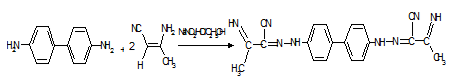 Nitrous acid was prepared by dissolving sodium nitrite ( 10 mmol) in water (3.0 mL) and was cooled down to 0-5 oC. Benzidine (0.92 g, 5 mmol) was dissolved in concentrated hydrochloric (3 mL) acid and water rapidly cooled in ice bath. The nitrous acid at between 0-5 oC was poured in portions over 30 min. Into this solution. The reaction mixture was stirred for 2h. at this temperature. The resulting diazonium salt solution was then added dropwise to a well-cooled and stirred solution of 3-aminocrotononitrile (0.82 g, 10 mmol) in sodium acetate (2 g) dissolved in 15 mL ethanol and 10 mL water. The pH of the coupling mixture, in each case, was maintained at 5-6 through the coupling process by adding sodium acetate. Stirring was continued for 4h. at 0-5 oC. The precipitated products separated upon dilution with cold water (50 mL) were filtered off, washed with water several times, and dried. The obtained product was recrystalized from DMF-H2O mixture (2:3 by volume) to give [(4,4'-dihydrazone biphenyl)]-bis(3-iminobuthyronitrile) (1) as red crystals, yield 1.44 g (78%), mp: 289 oC dec. Anal. Cal. for C20H18N8; C: 64.86%; H: 3.24%; N: 30.37%. Found: C: 64.35%; H: 3.52%; N: 29.86%. IR (KBr) υ (cm-1): 3435, 3321 (-NH); 3057 (Aromatic C-H); 2970 (Aliphatic C-H); 2207 (C=N). 1H-NMR (DMSO-d6, 25 oC) δ(ppm): 2.45 (6H, s, pyrazole-CH3); 2.80 and 2.90 (2H, s, =NH); 7.60-7.80 (8H, dd, Ar-H); 12.36 (2H, b, hydrazo-NH). MS m/z (M+): 370. The general route is outlined in Scheme 1.