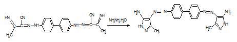 Hydrazine hydrate (0.5 mL) was added to a solution of (1) (0.083 g, 0.225 mmol) in 20 ml ethanol. The reaction mixture was heated under reflux for 3-4h., then cooled at room temperature. Water was added and the resulting precipitate product was filtered off, washed with water several times, and dried. The obtained product was recrystalized from DMF-H2O mixture (2:3 by volume) to give 4,4'-bis [3-methyl-5-amino-1-H-pyrazol-4-ylazo] biphenyl (2) as dark red crystals, yield (69%), mp: 343 oC dec. Anal. Cal. for C20H20N10; C: 60.00%; H: 5.00%; N: 35.00%; Found: C: 59.21%; H: 5.61%; N: 34.25%. IR (KBr) υ (cm-1): 3446 (-NH); 3310-3195 (-NH2); 3100-3050 (Aromatic C-H); 2970 (Aliphatic C-H). 1H-NMR (DMSO-d6, 25 oC) δ(ppm): 2.35, 3.32 (6H, s, pyrazole-CH3); 6.06, 7.10 (4H, b, pyrazole-NH2); 7.51-8.24 (8H, dd, Ar-H); 11.65-12.17 (2H, b, pyrazole-NH). MS m/z (M+): 400. The general route is outlined in Scheme 2.