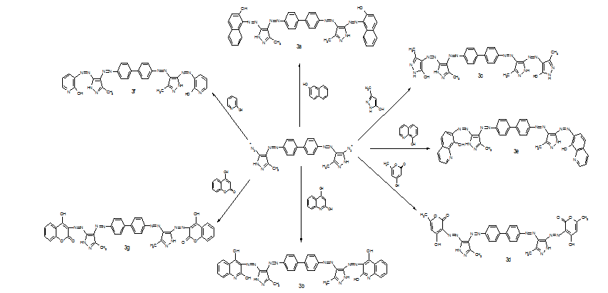 Synthesis of hetaryltetrakisazo dyes 3 (a-g) Synthesis of 4,4'-bis [3-methyl-5-(2'-hydroxynaphthaline-1'-ylazo)-1-H-pyrazole-4-ylazo] biphenyl (3a).