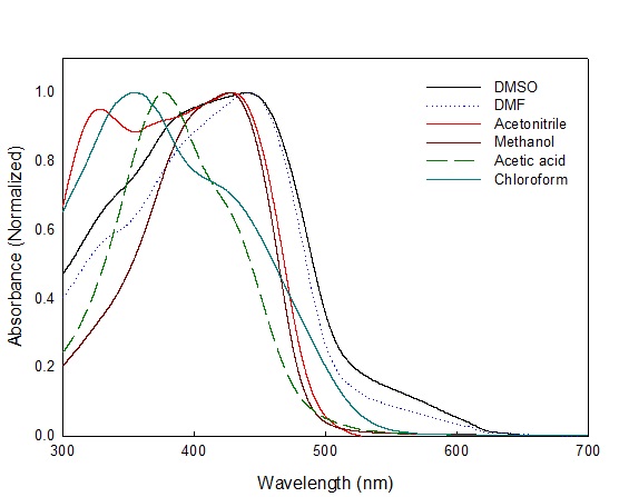It was observed that λmax of the dyes shifted hypsochromically in acetic acid with respect to the λmax in methanol except for dyes 3a, and 3e. λmax values of dyes in DMSO and DMF were shifted bathochromically with respect to the λmax in methanol except for 3c. λmax values of dyes in DMF were shifted bathochromically with respect to the λmax in methanol except for 3g. For example, the absorption maxima of 3a was observed at 374 nm in acetic acid, 382 nm in DMSO, 377 nm in DMF, and 371 nm in methanol, respectively (Fig. 1).