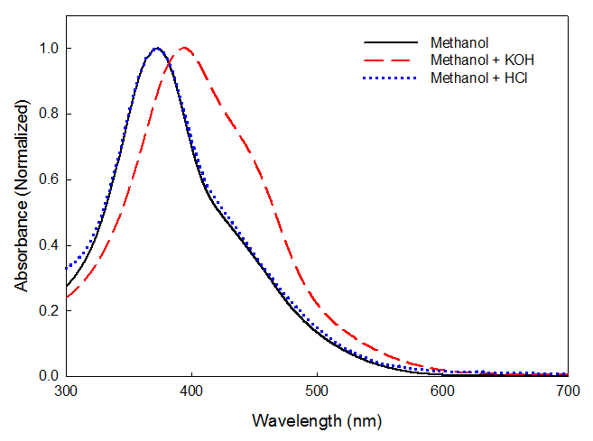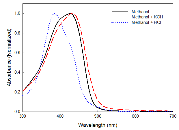 The absorption spectra of the dyes in methanol were quite sensitive to the addition of base (potassium hydroxide, ). Therefore, the λmax of dyes 3(a-g) showed bathochromic shifts with the addition of base to methanol. For example, λmax of 3a was recorded at 371 nm in methanol and 392 nm in methanol + KOH. λmax of was recorded at 426 nm in methanol and 432 nm in methanol + KOH (Fig.3).