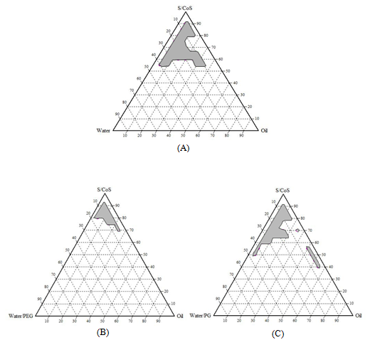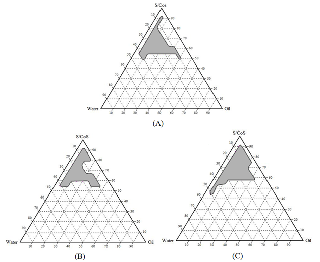 Fig. 1: Pseudoternary phase diagrams of caprylic/capric triglyceride (oil)/PEG-8 caprylic/capric (surfactant, S)/polyglyceryl-3 diisostearate (cosurfactant, CoS)/water with Km 2:1 (A), 3:1 (B) and 4:1 (C)