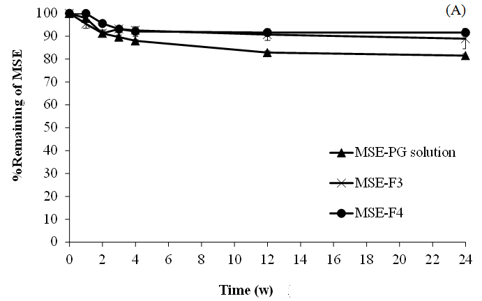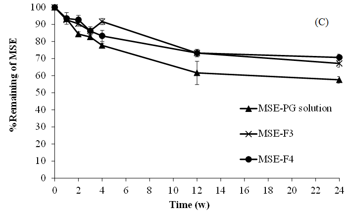 From the above results, F1 and F2 showed cloud point lower than 45 °C and thus only F3 and F4 formulations were selected for further studies. The MSE was incorporated into these microemulsions at 2% w/w (namely MSE-F3 and MSE-F4). The PG solution containing MSE (namely MSE-PG solution) was used as the control. The results are shown in fig. 3. The degradation of MSE incorporated in F3 and F4, stored at 4 °C, 75% RH after 6 mo, was not significantly different and was shown to be the lowest (fig. 3A). However, significant degradation of MSE was observed in the PG solution compared with F4 microemulsion. The different in the ability to protect the degradation of MSE by various formulations was significantly observed when tested at a higher temperature. At RT, the degradation of MSE incorporated in both F3 and F4 was again not significantly different. However, both microemulsions have significantly enhanced the stability of MSE compared to the PG solution (fig. 3B). The percentage remaining of MSE loaded in both F3 and F4 stored at RT, 75% RH for 6 mo was higher than 86%, suggesting that MSE-loaded microemulsions have good chemical stability. However, at 45 °C, the degradation of MSE increased. F4 showed the highest percentage remaining of MSE followed by F3 and the PG solution, respectively (fig. 3C). These results are in agreement with the cloud point temperature as previous discussed. F4 showed the highest cloud point, suggesting that it was the most thermodynamically stable microemulsion. Therefore, this may explain the most efficient performance of F4 to protect MSE degradation at high temperature.
