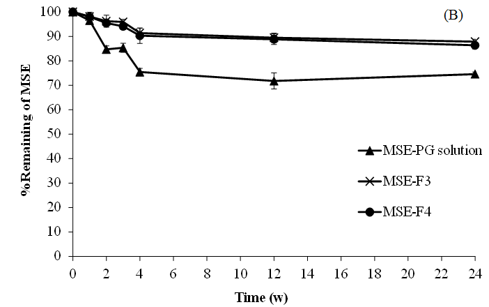 The microemulsion formulations were incorporated with MSE at 2% by weight and then subjected to further studies including stability test, release and intestinal lipolysis study. MSE dissolved in a solution consisting of 50% PG mixed with 50% water (the PG solution) was used as a control.