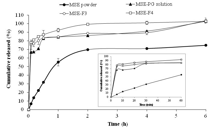 Fig. 4: In vitro release profile of the mulberry stem extract from various formulations including unformulated extract powder (MSE powder), propylene glycol solution (MSE-PG solution) and microemulsions (MSE-F3 and MSE-F4) in phosphate buffer solutions, pH 6.8. The insert showed the release profiles during the first 60 min. Values are represented as mean±SD (n=3)